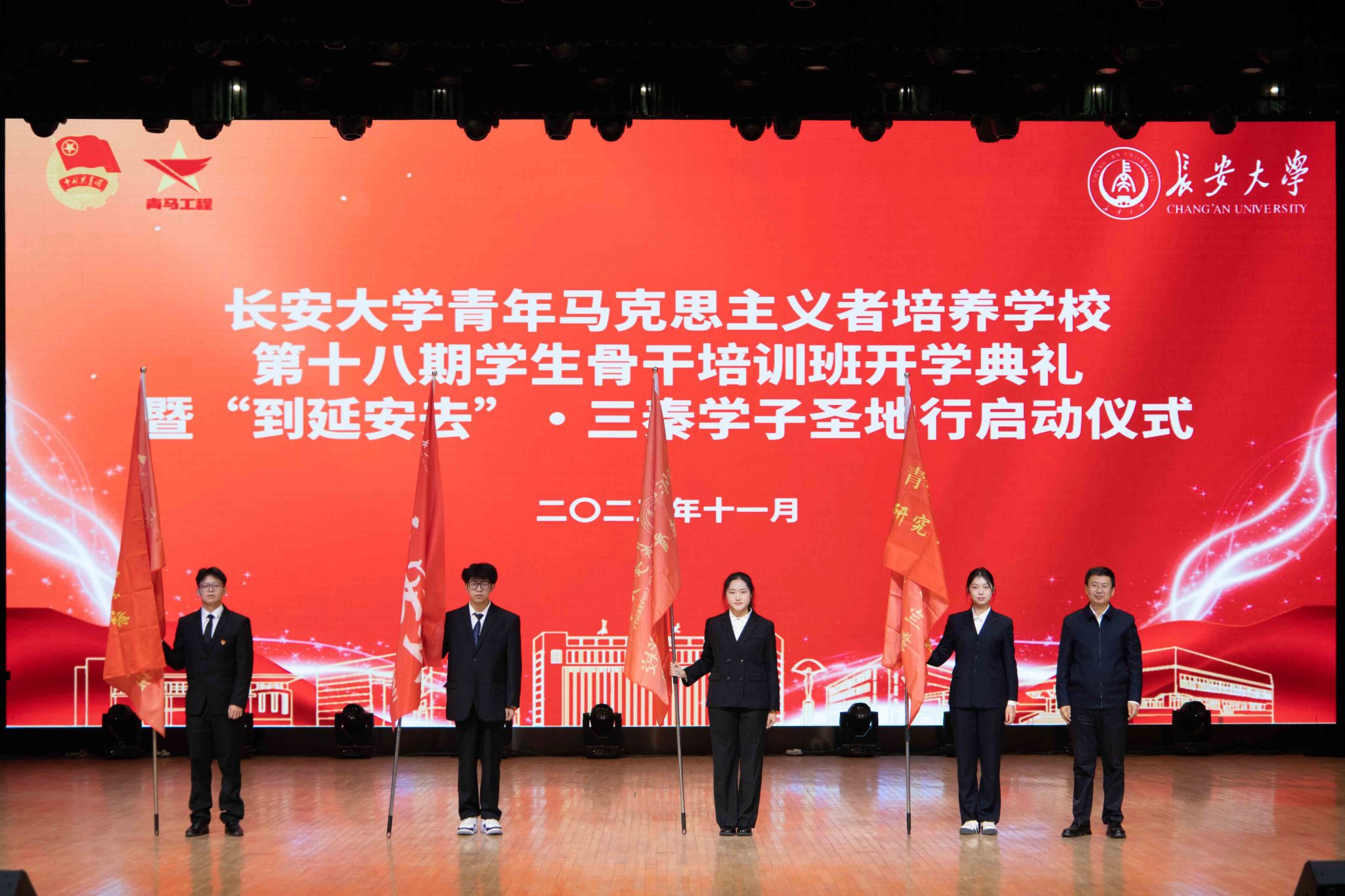 典礼上,李文雄为第十八期学生骨干培训班和“到延安去”·三秦学子圣地行授旗。参会领导分别为第十七期青马班优秀学员代表、结业学员代表颁发荣誉证书、结业证书。