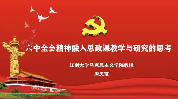 会议第一项内容,邀请江南大学马克思主义学院唐忠宝教授做题为《党的十九届六中全会精神融入思政课教学与研究的思考》的线上报告。唐教授以翔实新锐的网络素材,从“坚持党的领导,反对历史虚无主义”、“坚持人民至上,信仰共产主义”、“坚持理论创新,推进马克思主义中国化”三个方面,对十九届六中全会会议精神如何下沉并融入高校思政课课堂,做出了深入透彻的阐述和分析。唐老师的报告,学理性强、语言生动、分析透彻,为今后推进”三进“工作提供了有效的方法和有益的启示。