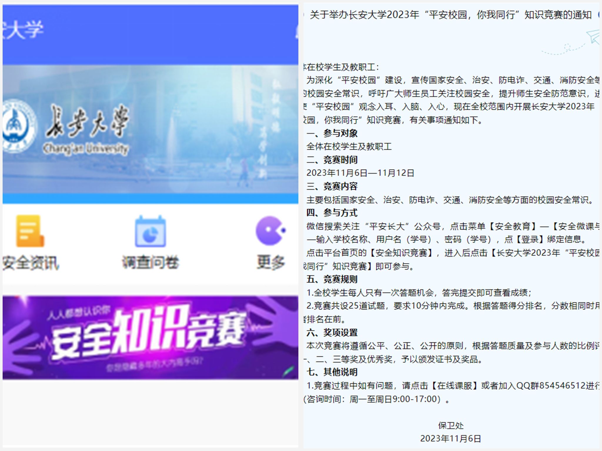 以赛促学,举办安全主题知识竞赛。为强化校园安全宣传教育,营造良好安全文化宣传氛围,11月6日至12日,保卫处在全校范围内举办了“平安校园,你我同行”知识竞赛,涉及国家安全、治安、防电诈、交通、消防安全等多方面校园安全常识,进一步提升c7网页版师生的安全防范意识与自防自救能力。