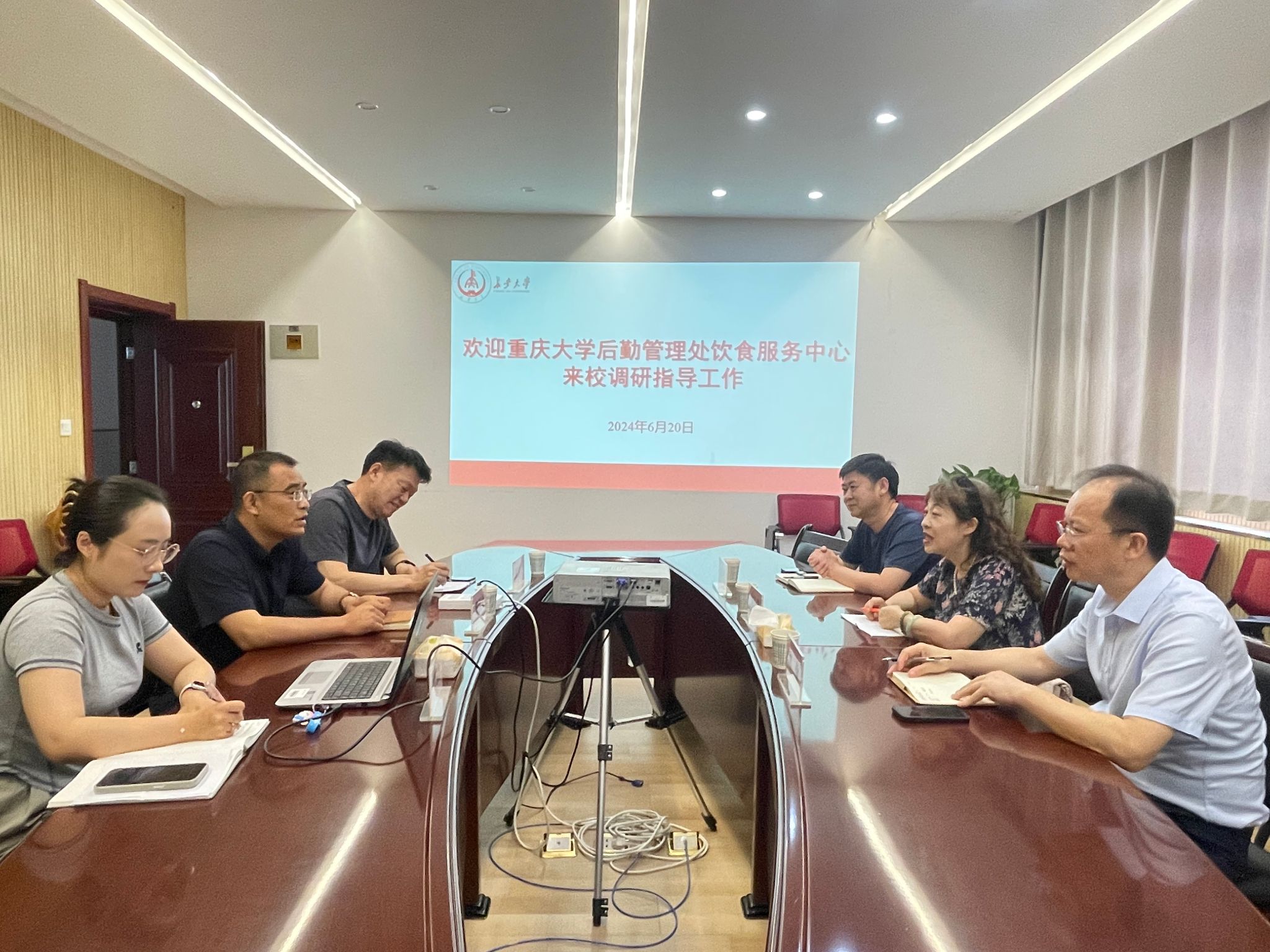 6月20日下午,重庆大学后勤管理处饮食服务中心主任庞金侠、副主任谢儆、食堂经营与管理部部长刘哲军一行3人来c7网页版调研交流饮食工作,c7网页版后勤管理处饮食服务中心相关人员陪同。