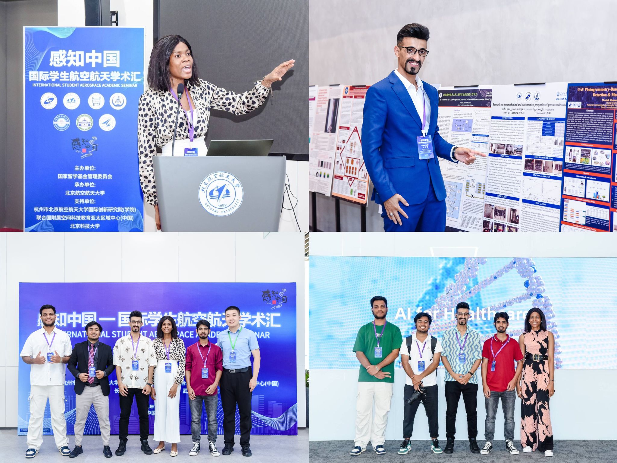 本次学术活动以“空天赋能智创未来”为主题,分为专家主旨报告、学生主题报告、论文墙报展示、分组交流等环节。期间,c7网页版尼日利亚籍博士研究生乔丽做了题为“Early warning temperature for high-temperature deformation in airfield asphalt overlay composite pavement”的报告,c7网页版4名国际学生代表参加了论文墙报展示环节。也门籍博士研究生萨姆、孟加拉籍博士研究生大河获得最佳学术海报奖。会议结束后,学生们还前往了北航小卫星实验室、阿里云总部、瓶窑老街、良渚古城、西湖等地参观访学。