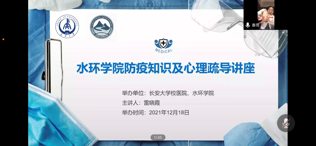 12月18日晚,水利与环境学院邀请校医院雷晓霞医生召开了防疫知识及心理疏导线上讲座。院长白波、学院工会主席陈志红、水环学院的教职工以及全体学生参加了线上讲座,讲座由院党委副书记王妍主持。