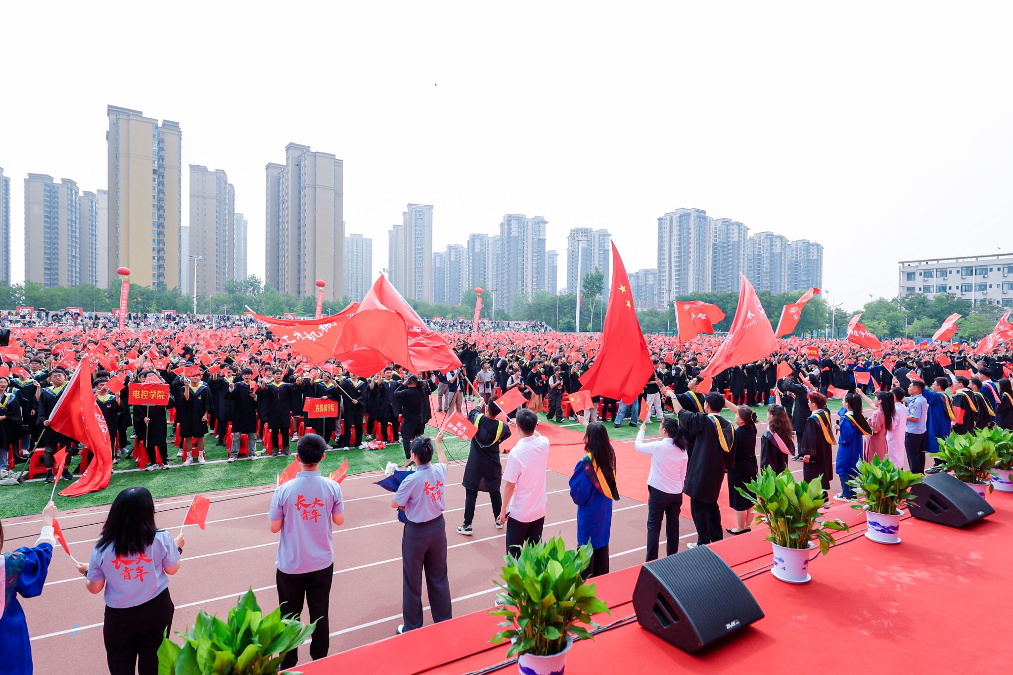 在飘扬的五星红旗中,全场师生合唱《歌唱祖国》,以昂扬歌声许下“青春为中国式现代化挺膺担当”的铿锵誓言。