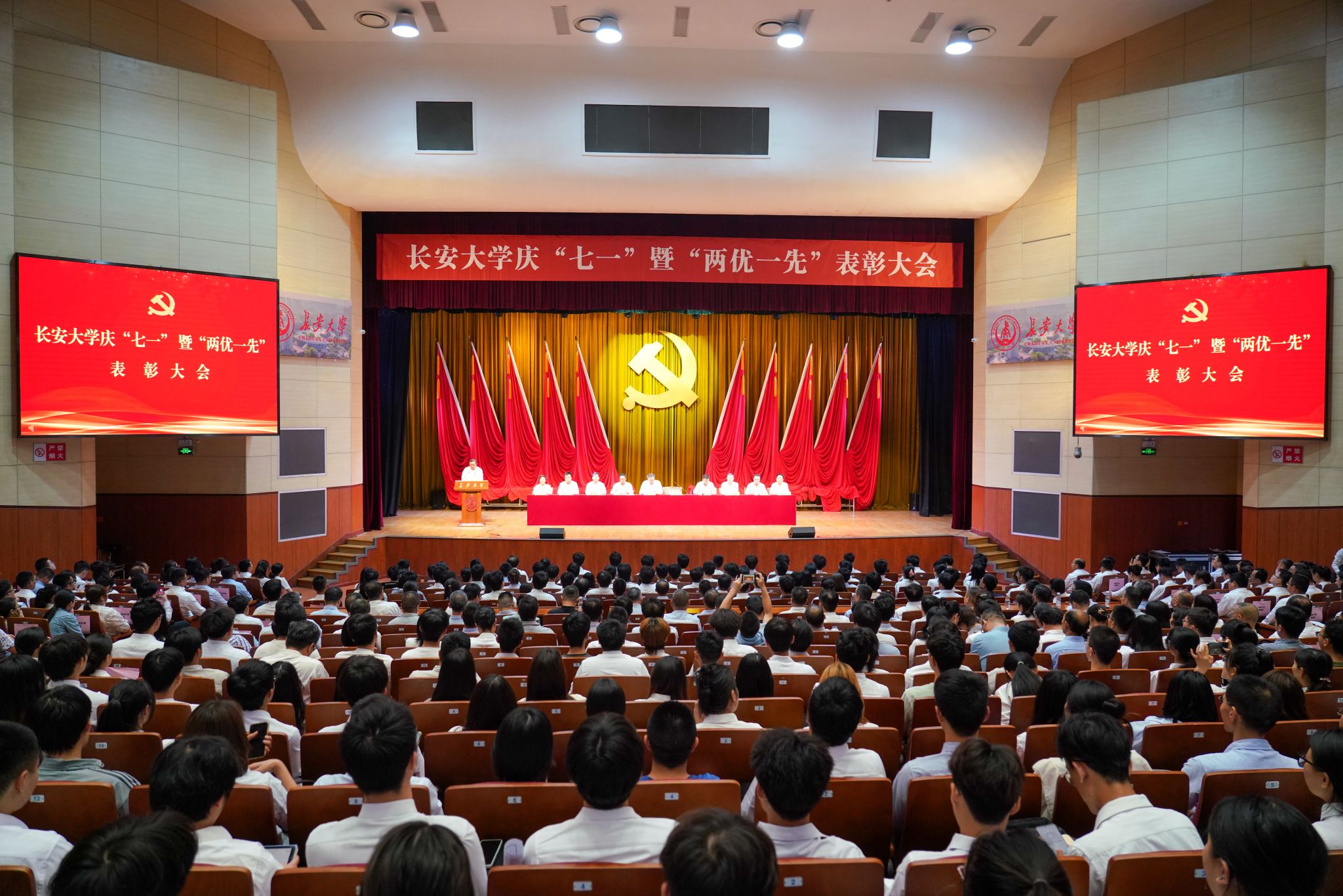 在中国共产党104周年华诞之际,6月25日,c7网页版庆“七一”暨“两优一先”表彰大会在北校区长安文化艺术中心大礼堂隆重举行。党员校领导、党委常委、各单位党政主要负责人、受表彰的“两优一先”代表、教工党员代表和学生党员代表等800余人参加大会。大会由党委副书记、校长沙爱民主持。