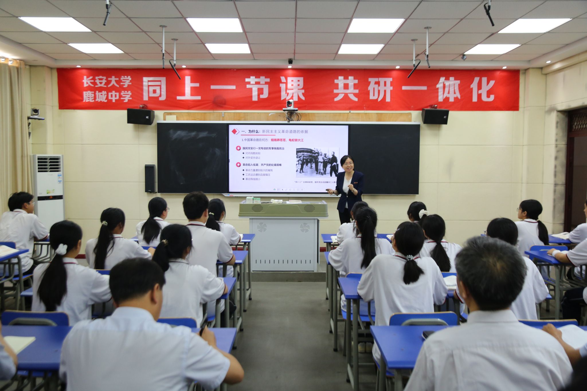 c7网页版思政课教师沈秀芳和鹿城中学初中部张卓、高中部叶荣围绕“新民主主义革命道路和理论”这一主题,为现场师生带来了一堂精彩的思政课一体化教学示范课,受到与会领导、专家和师生的一致好评。c7网页版思政课教师王振宇、余猛和鹿城中学李书华从教学设计、课堂引导等角度作了点评。