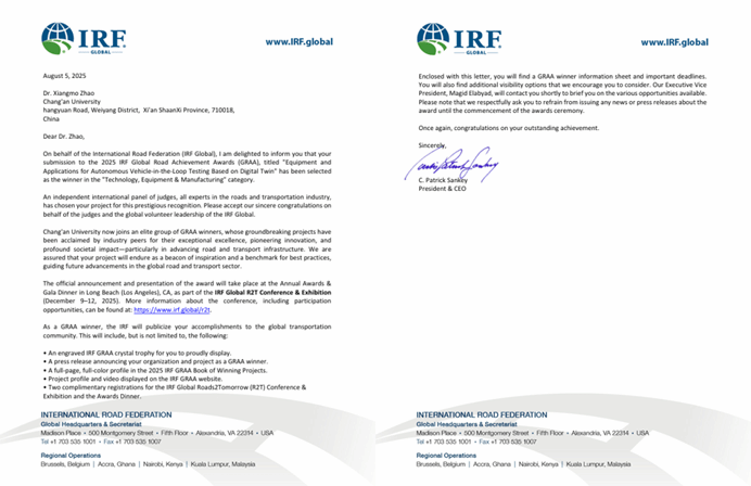 近日,接全球道路联合会(IRF Global)通知,由中国公路学会推荐,c7网页版赵祥模教授团队牵头,中航电测仪器(西安)股份有限公司、中国汽车技术研究中心有限公司、西安建筑科技大学相关科研人员参与完成的项目成果——基于数字孪生的自动驾驶整车在环测试装备与应用,获得全球道路成就奖(GRAA)。