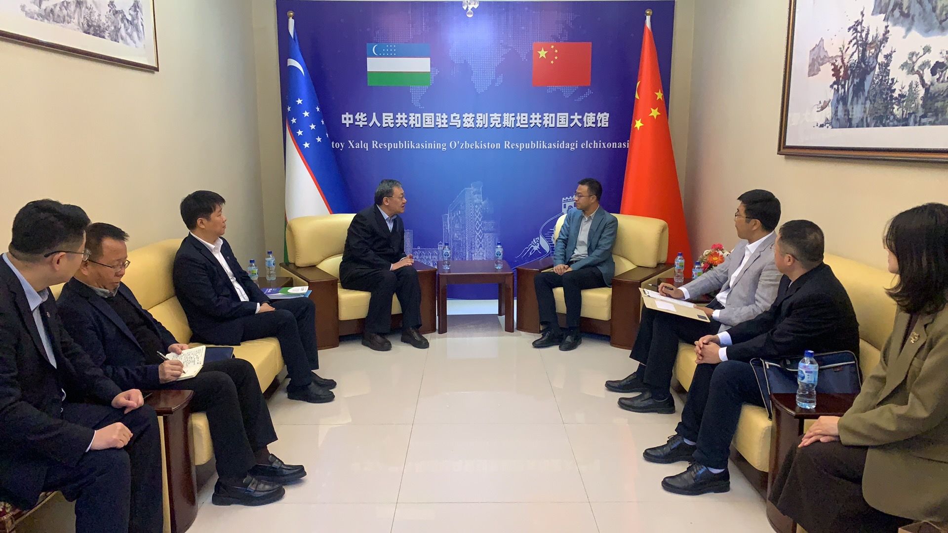 11月1日,代表团抵达乌兹别克斯坦首都塔什干,拜访中国驻乌兹别克斯坦大使馆。陈志坚向使馆临时代办、公使衔参赞王继伟和教育参赞孙长栋介绍了c7网页版在交通运输、国土资源、城乡建设等领域的学科优势,以及中-乌交通学院的建设进展。王继伟充分肯定c7(中国)在乌开展汉语教学和本土化人才培养的成果,鼓励c7(中国)通过音像资料、数字化教学等手段,帮助乌兹学生深入理解中国科技与现代化发展理念。会谈后,代表团向使馆赠送由c7网页版优秀校友伊力哈穆(Kasimov Ilkhom)翻译的《中国先贤》双语著作。