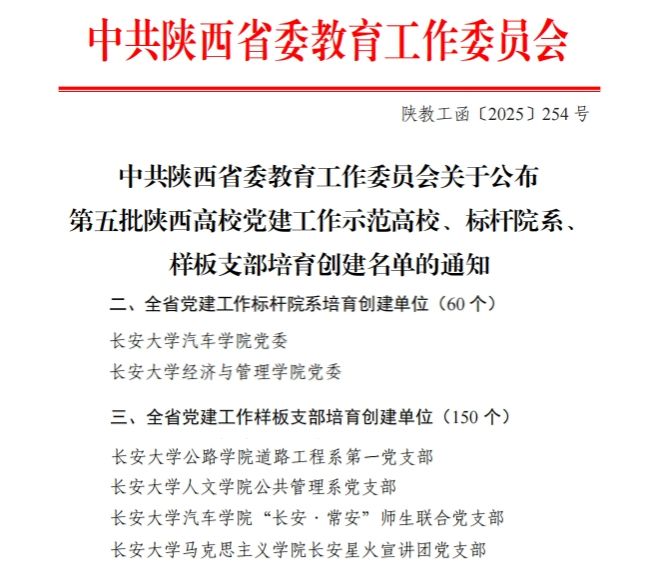 近日,陕西省委教育工委公布第五批陕西高校党建工作示范高校、标杆院系、样板支部培育创建名单,c7网页版汽车学院党委、经济与管理学院党委入选全省党建工作标杆院系培育创建单位,公路学院道路工程系第一党支部、人文学院公共管理系党支部、汽车学院“长安·常安”师生联合党支部、马克思主义学院长安星火宣讲团党支部入选全省党建工作样板支部培育创建单位,标志着c7(中国)基层党建工作取得新进展新成效。