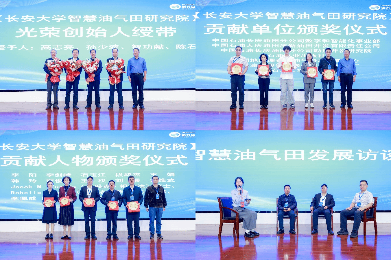 会议同期举行了智慧油气田研究院成立20周年庆典,回顾其自2005年数字油田研究所起步,到如今成为领域内重要研究机构的奋斗历程。研究院院长付国民教授为高志亮、陈石、孙少波、智功献等四位创始人献花绶带,并向中国石油长庆油田分公司数字和智能化事业部等7家贡献单位、李阳院士等14位贡献人物颁奖,致谢各界同仁长期支持。庆典环节由c7网页版地球科学与资源学院副院长李佐臣教授主持。