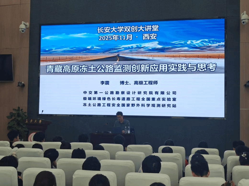 李震系统阐述了全球冻土的分布特征及其对生态、气候和工程建设的深远影响,并指出我国青藏高原及西部高山地区近180万平方千米的高海拔冻土对公路工程建设与运维提出的重大挑战。他提到,中交集团及中交一公院通过三代人50年的技术积累,构建了“两廊三场”观测研究体系,为我国冻土公路工程创新奠定了坚实基础。在报告中,李震重点分享了冻土区公路监测体系的构建思路、创新成果及新型传感器研发进展。他通过青藏公路、共和至玉树高速公路等实际工程案例,生动展示了如何利用新技术实现极端冻融环境下全要素精准观测,从而精准诊断公路病害、提升工程稳定性。他强调,推动冻土区公路病害诊治技术发展,需加强多学科融合与智能化手段应用,为未来高寒地区交通基础设施可持续发展提供科技支撑。在互动环节,李震博士结合自身科研经历,鼓励同学们将专业学习与国家战略需求相结合,积极参与创新创业实践,通过赛事锻炼创新思维与实践能力。