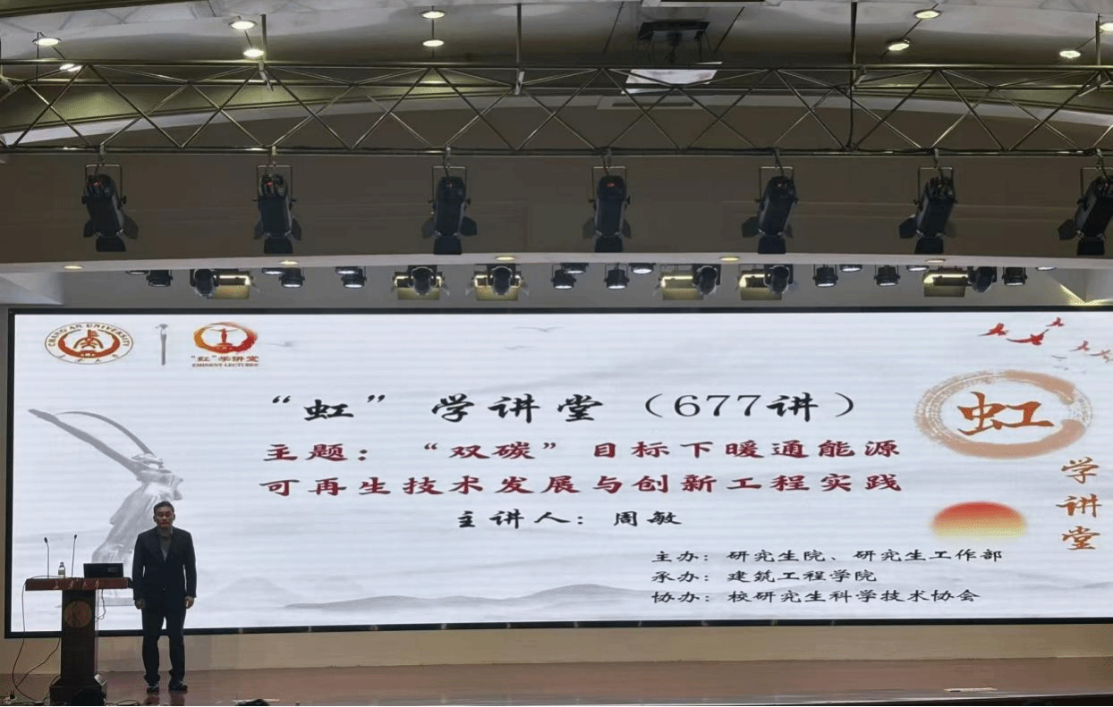 11月11日上午,由研究生院、研究生工作部主办,建筑工程学院承办,校研究生科学技术协会协办的“虹”学讲堂第677讲在南校区北院学术交流中心举行。中建西北设计院周敏工程师作题为“‘双碳’目标下暖通能源可再生技术发展与创新工程实践”的报告,建筑工程学院谷雅秀教授主持,相关学院共300余名师生参加讲座。