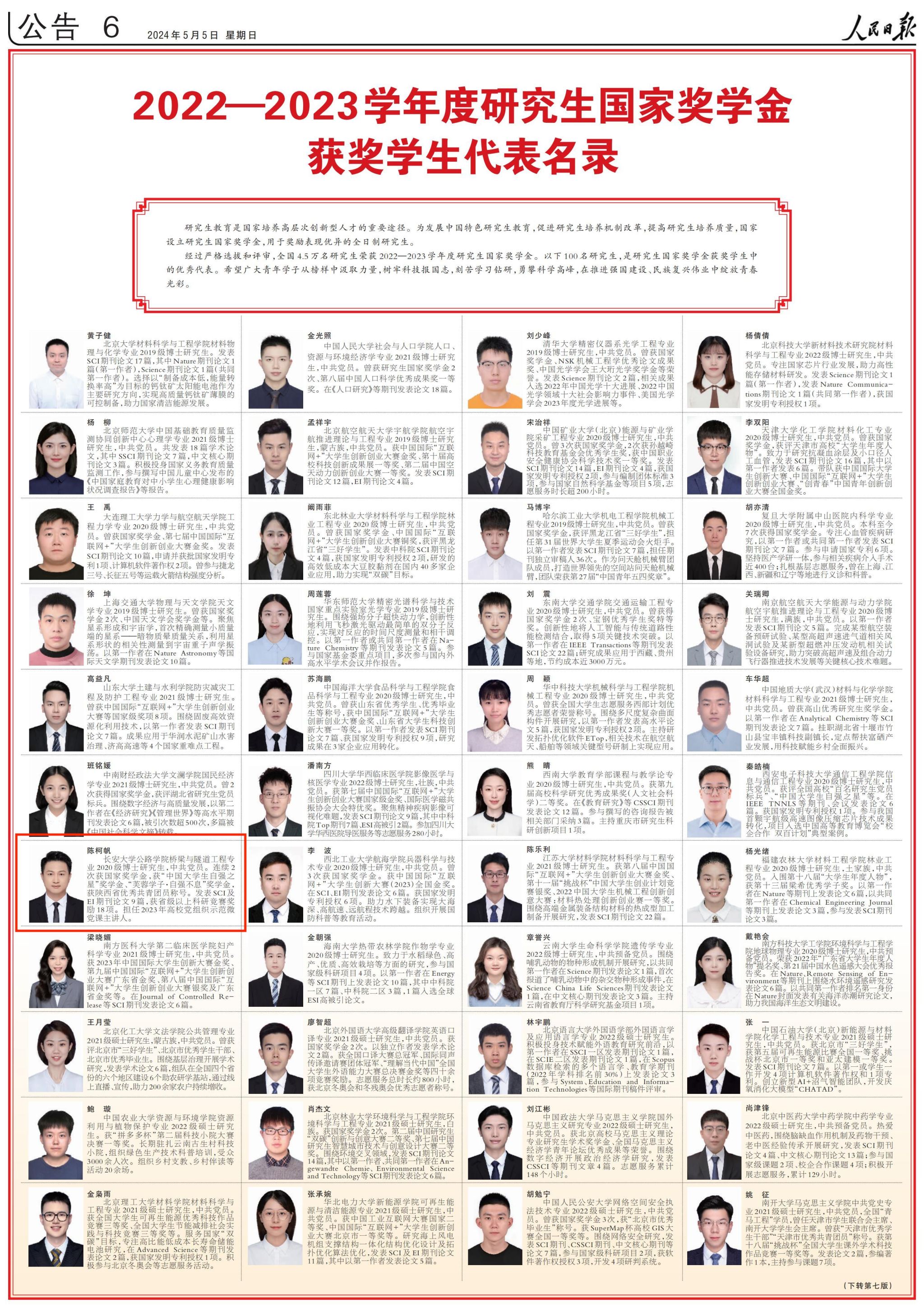 近日,《人民日报》专版刊登《2022—2023学年度本专科生国家奖学金获奖学生代表名录》《2022—2023学年度研究生国家奖学金获奖学生代表名录》,c7网页版汽车学院物流工程专业2020级本科生黎敏琦、公路学院桥梁与隧道工程专业2020级博士研究生陈柯帆入选名录,这是c7网页版本科生近五年连续荣登《人民日报》本专科生国家奖学金获奖学生代表名录,研究生连续两年入选研究生国家奖学金获奖学生代表名录。