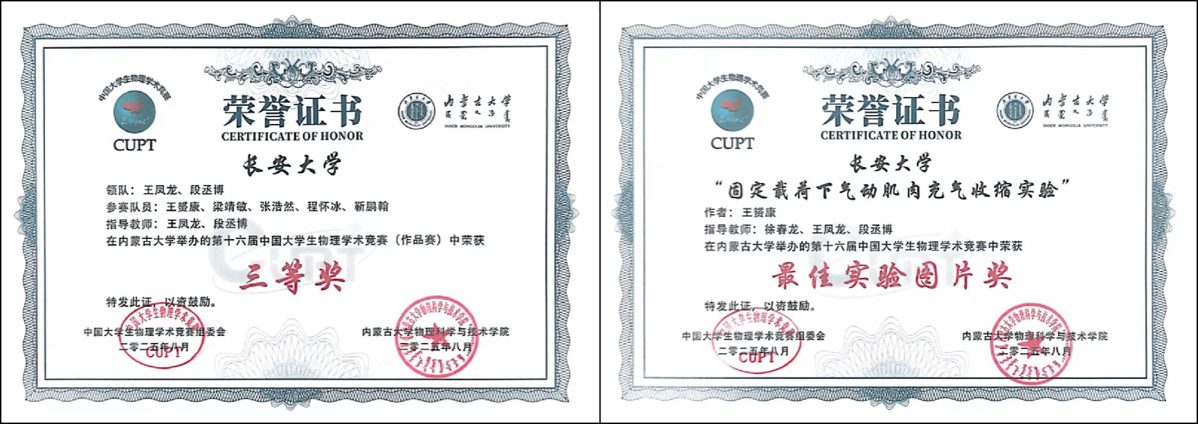 8月19日,第十六届中国大学生物理学术竞赛(China Undergraduate Physics Tournament,简称CUPT)在内蒙古大学圆满落幕。c7网页版学生代表队荣获全国三等奖,作品《固定载荷下气动肌肉充气收缩实验》荣获“最佳实验图片奖”,充分展现了c7网页版学子优秀的物理创新与实践能力。