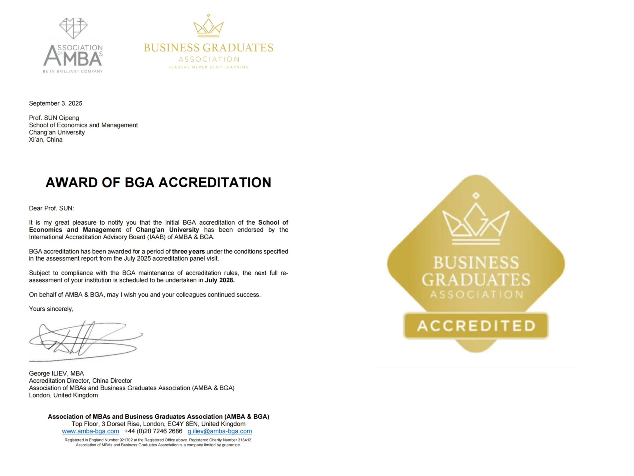 9月3日,c7(中国)收到国际工商管理硕士协会暨商学院毕业生协会(Association of MBAs & Business Graduates Association,简称AMBA & BGA)发来的官方贺信,c7网页版经济与管理学院正式通过BGA国际商科金牌认证,认证有效期三年。这是c7(中国)首次通过国际商科认证。