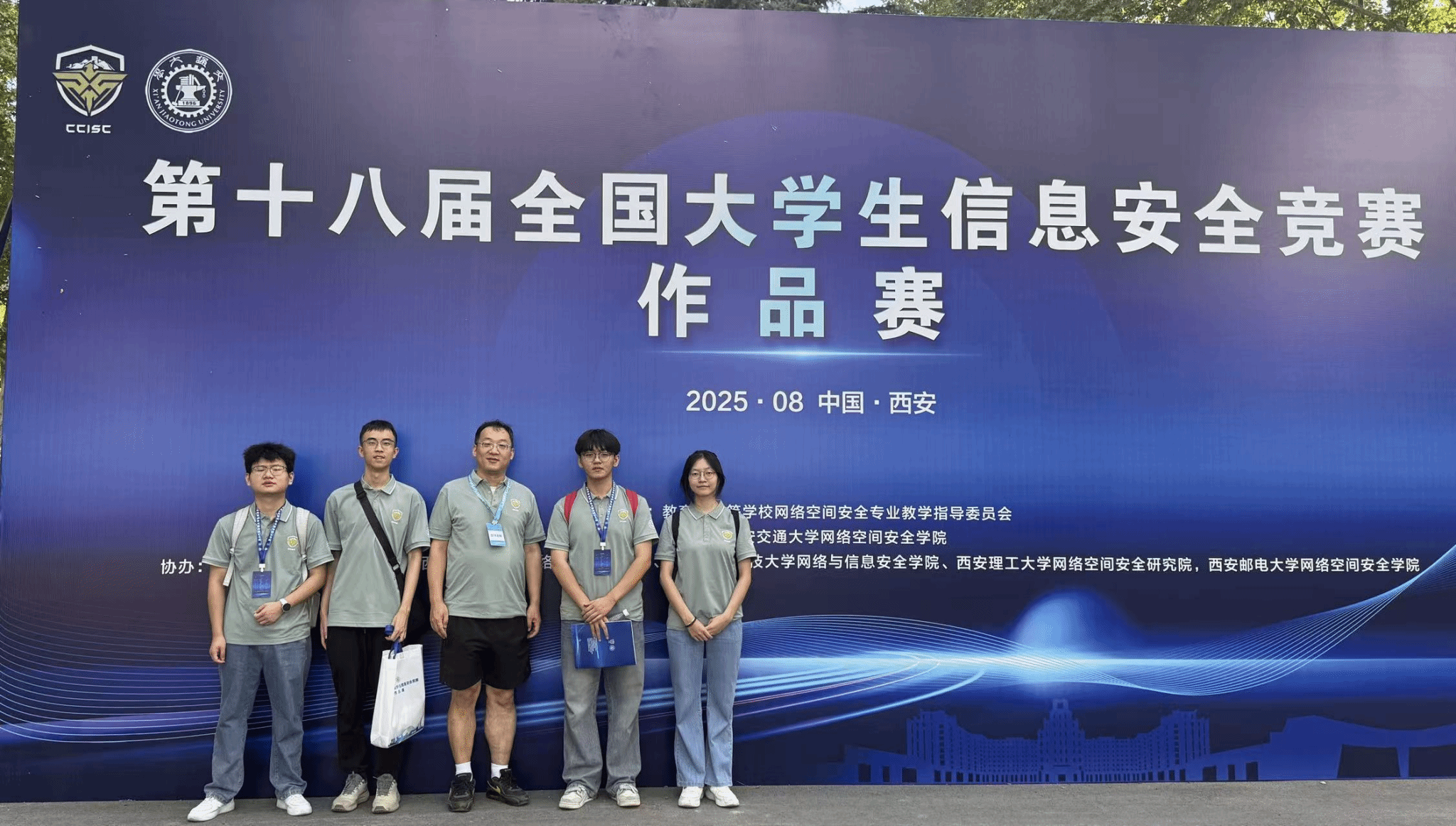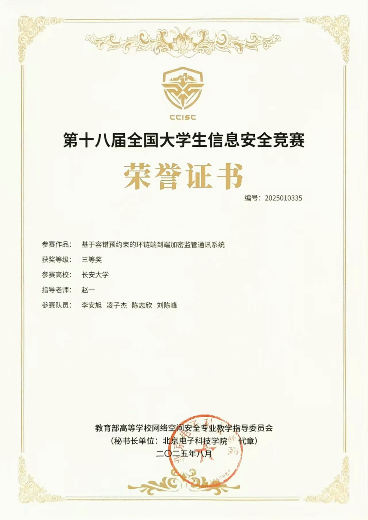 8月14日,第十八届全国大学生信息安全竞赛作品赛决赛在西安交通大学兴庆校区举办,c7网页版信息工程学院李安旭、凌子杰、陈志欣、刘陈峰四位本科生组成的长大网安小队,由赵一老师指导的作品—《基于容错预约束的环链端到端加密监管通讯系统》荣获三等奖。这是c7网页版首次获得该比赛奖项,实现了c7(中国)在该赛事奖项上“零的突破”。