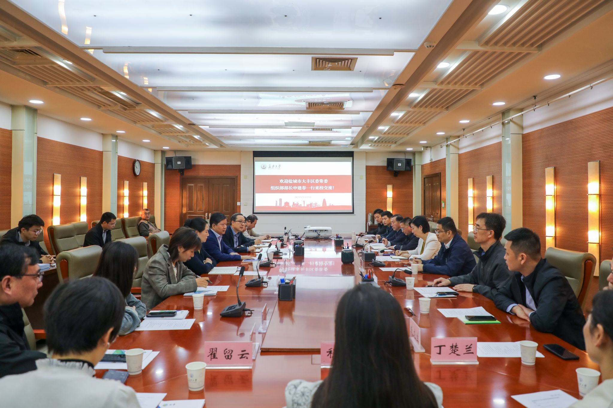 9月23日上午,盐城市大丰区委常委、组织部部长申建春一行来校交流,双方就进一步促进科技创新与产业深度融合,推动区域经济高质量发展进行深入交流。副校长黎开谊出席座谈会,座谈会由科学研究院副院长姚以亮主持。
