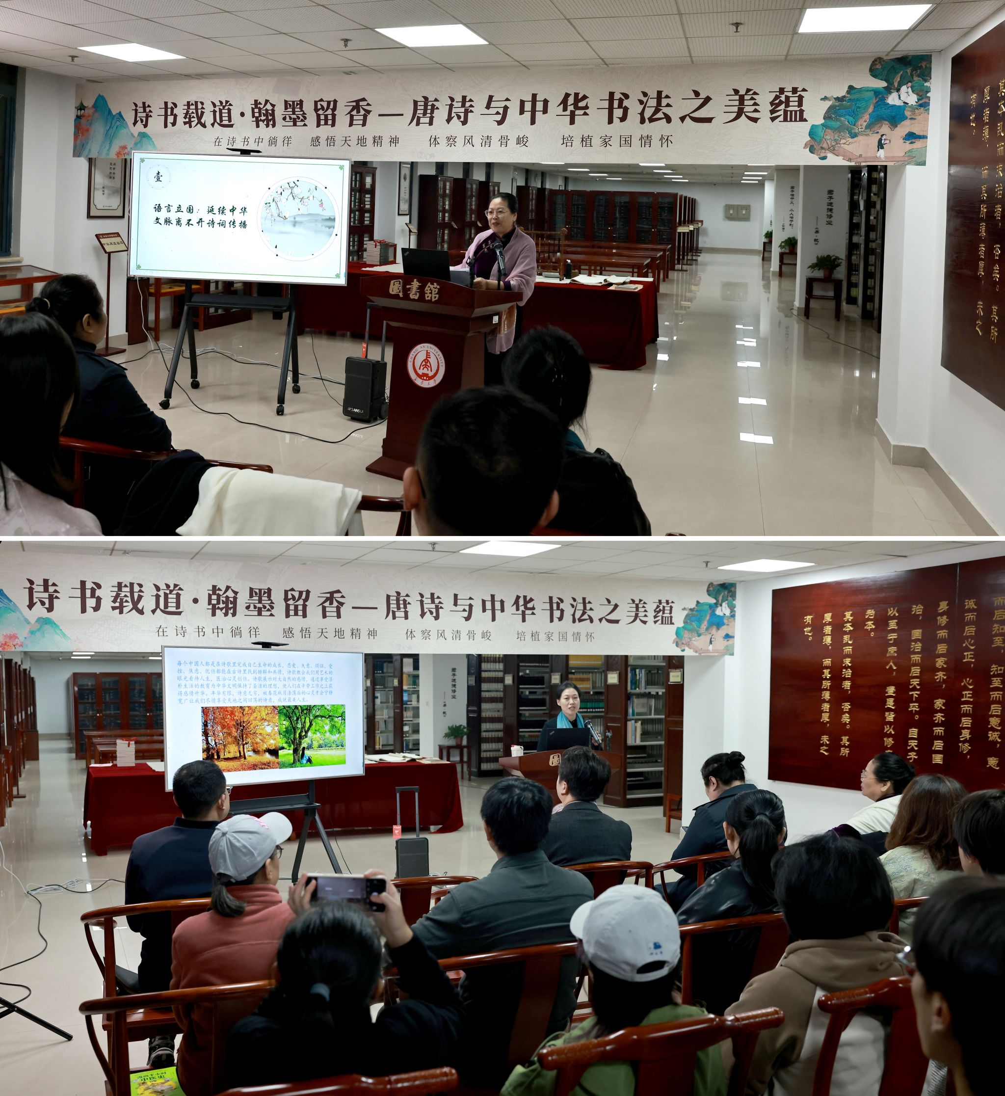 彪晓红教授聚焦“唐代四大女诗人”——薛涛、李冶、鱼玄机与刘采春,通过解读《八至》《啰唝曲》《赋得江边柳》《筹边楼》等代表作,展现了女诗人以清词丽句勾勒出的唐诗的别样风姿,勾画出她们“才情与豪情并具”的创作风貌,反映出她们的情感态度、价值追求与生命韧性。张红春教授以中国书法史上的“三大行书”为核心,深入剖析作品的艺术成就、精神内涵与历史背景,阐释了这些作品如何通过笔法、章法与墨法,承载文人哲思、家国情怀与人生智慧。