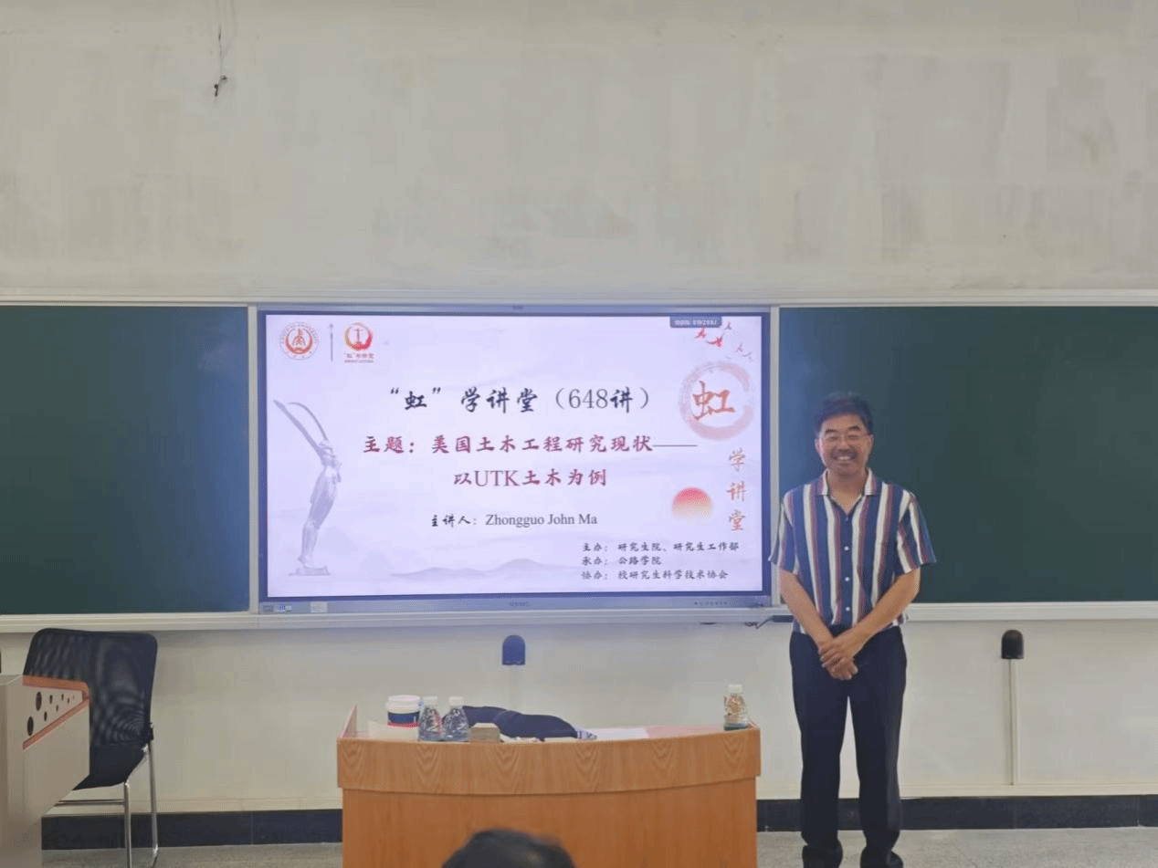 6月26日下午,由研究生院、研究生工作部主办,公路学院承办,校研究生科学技术协会协办的“虹”学讲堂第648讲在南校区北院b401教室举办。美国田纳西大学Zhongguo John Ma教授作题为“美国土木工程研究现状——以UTK土木为例”的报告,公路学院副院长韩万水教授主持,相关学院共180余名师生参加讲座。