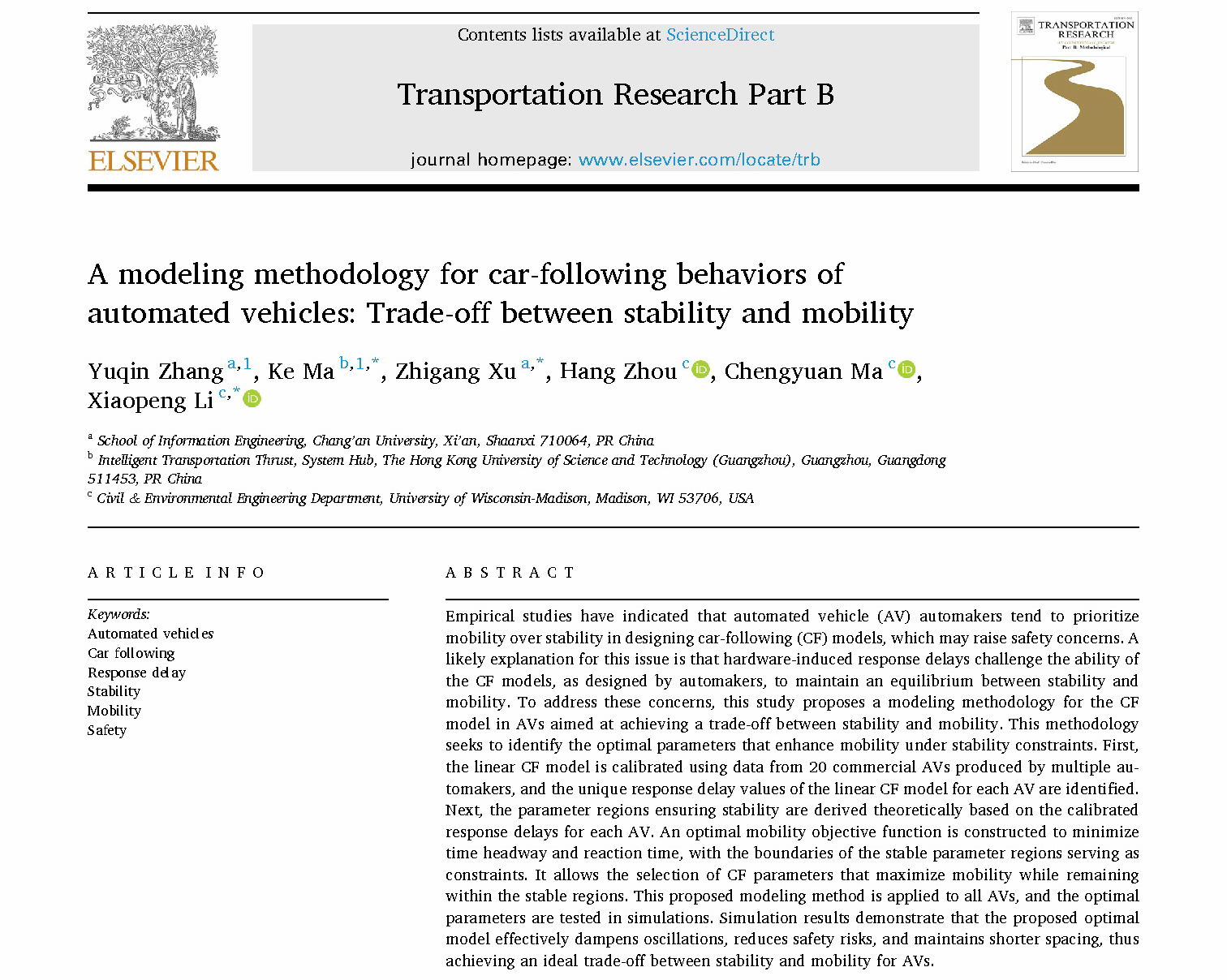9月16日,c7网页版信息工程学院徐志刚教授课题组在交通运输科学领域顶级期刊《Transportation Research Part B: Methodological》上发表了题为《A Modeling Methodology for Car-Following Behaviors of Automated Vehicles: Trade-off Between Stability and Mobility》的研究论文。徐志刚教授为论文通信作者,其博士生张宇琴为第一作者,c7网页版为第一作者单位。