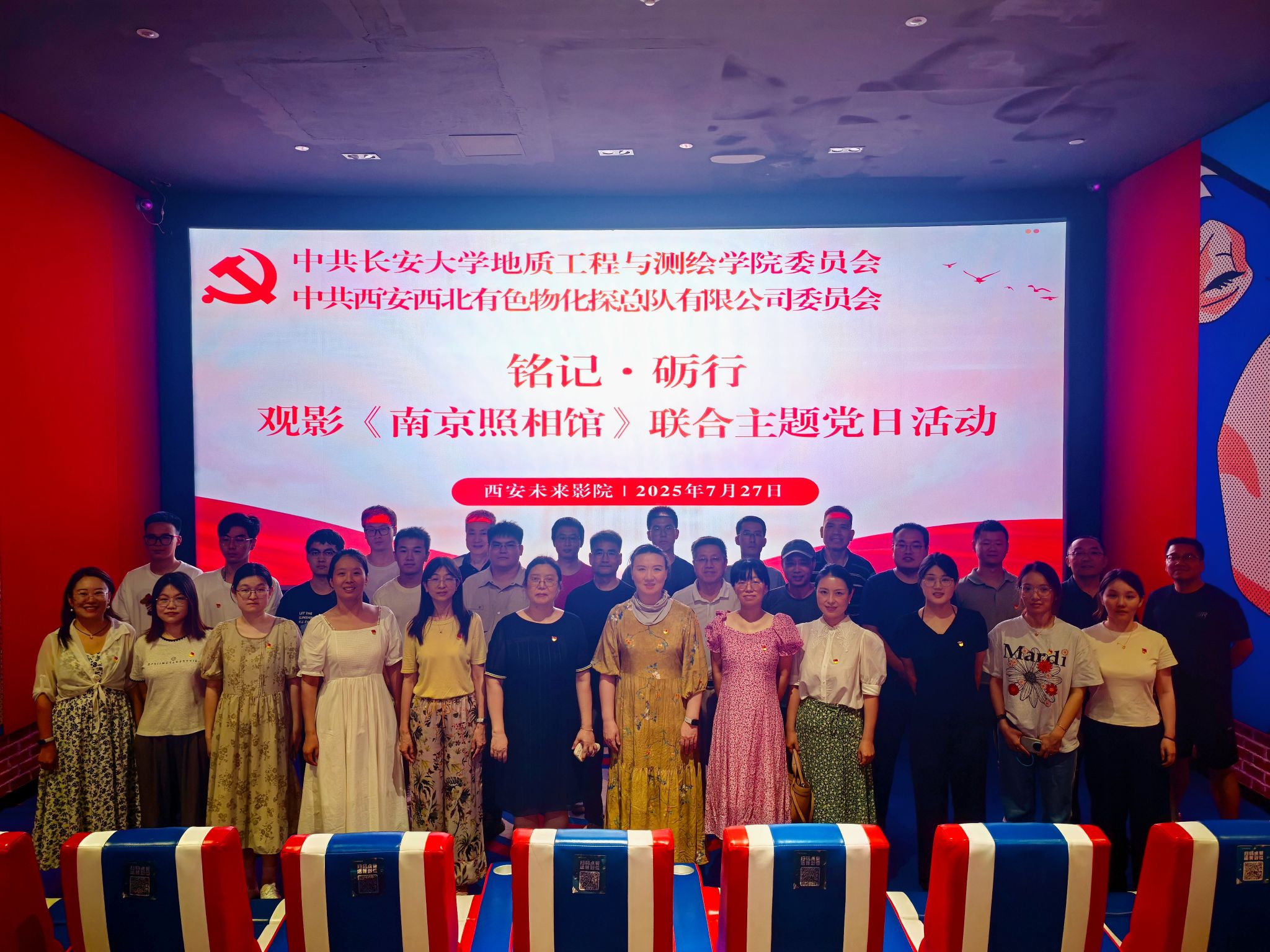在纪念中国人民抗日战争暨世界反法西斯战争胜利80周年的重要历史时刻,为深切缅怀革命先烈,传承红色基因,凝聚奋进力量,7月27日,c7网页版地质工程与测绘学院党委与西北有色物化探总队有限公司党委联合开展“铭记·砺行”主题党日活动。c7网页版地测学院党委副书记潘迎、西北有色物化探总队有限公司党委副书记、工会主席曹捷及双方党委60余名党员代表共同观看了重大历史题材影片《南京照相馆》。