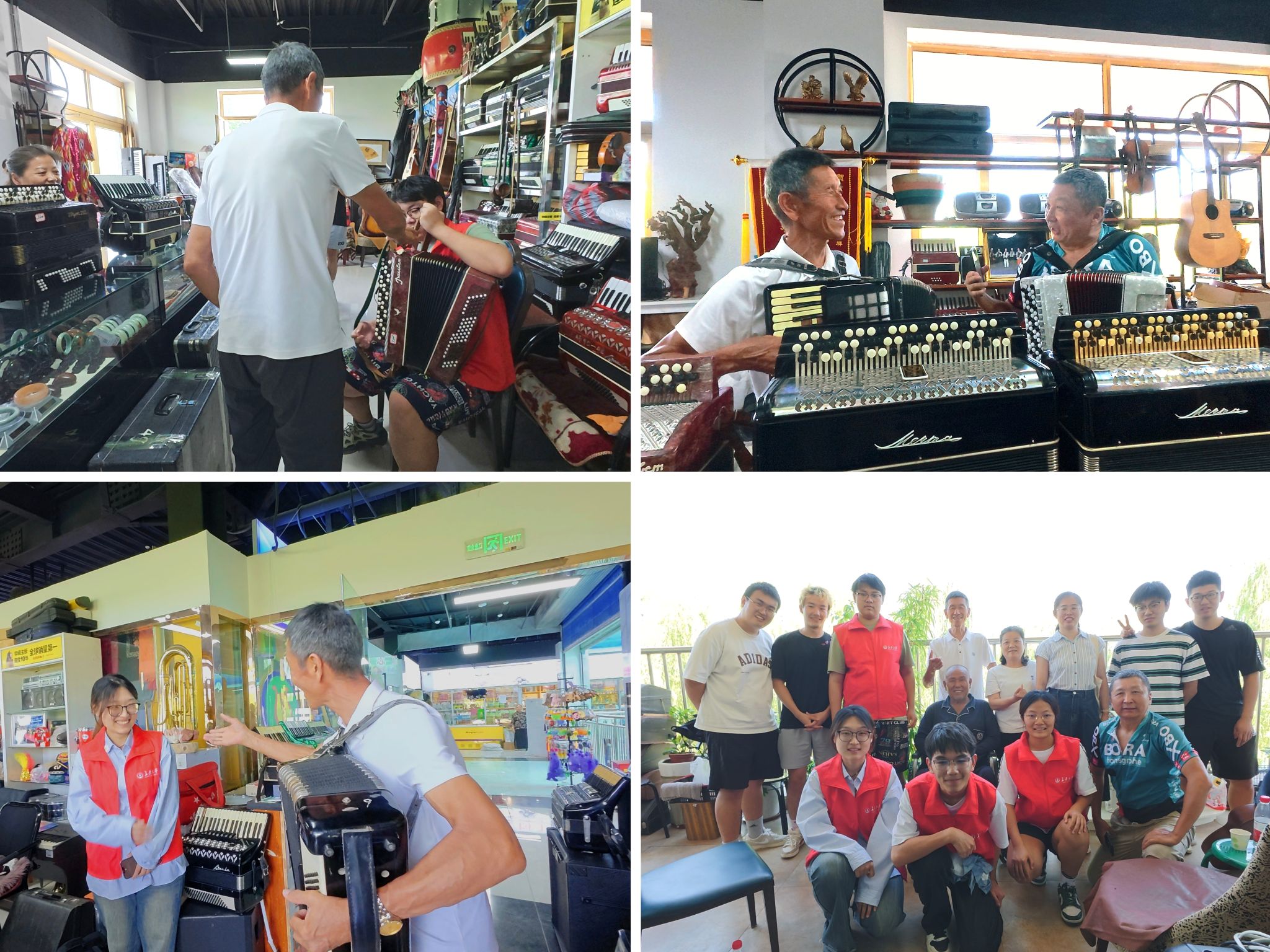 探多元文化街区,奏民族团结乐章。实践队走进历史悠久的汉人街大巴扎,在汉人街老字号乐器行,与手风琴艺术家何立志老师进行了深入的文化交流。何立志与友人姜熙为师生们带来一场激情澎湃的民族音乐表演。实践队成员赵博浩在老师们的指导下完成手风琴演奏初体验。活动中,师生与艺术家共唱《我们新疆好地方》,悠扬琴声与歌声交织成民族团结的动人乐章。