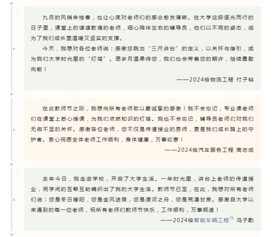 三是营造浓厚氛围,弘扬立德树人“主旋律”。通过横幅标语、橱窗海报、电子屏幕方式开展庆祝第41个教师节主题宣传活动,全方位展示学院广大教师在教书育人过程中担当作为、爱岗敬业、甘于奉献的感人事迹,加强节日氛围营造。“汽宇不凡”微信公众号面向学生征集“教师节祝福语”,推出《令公桃李满天下,何用堂前更种花》微信专辑,向教师们送上节日祝福。