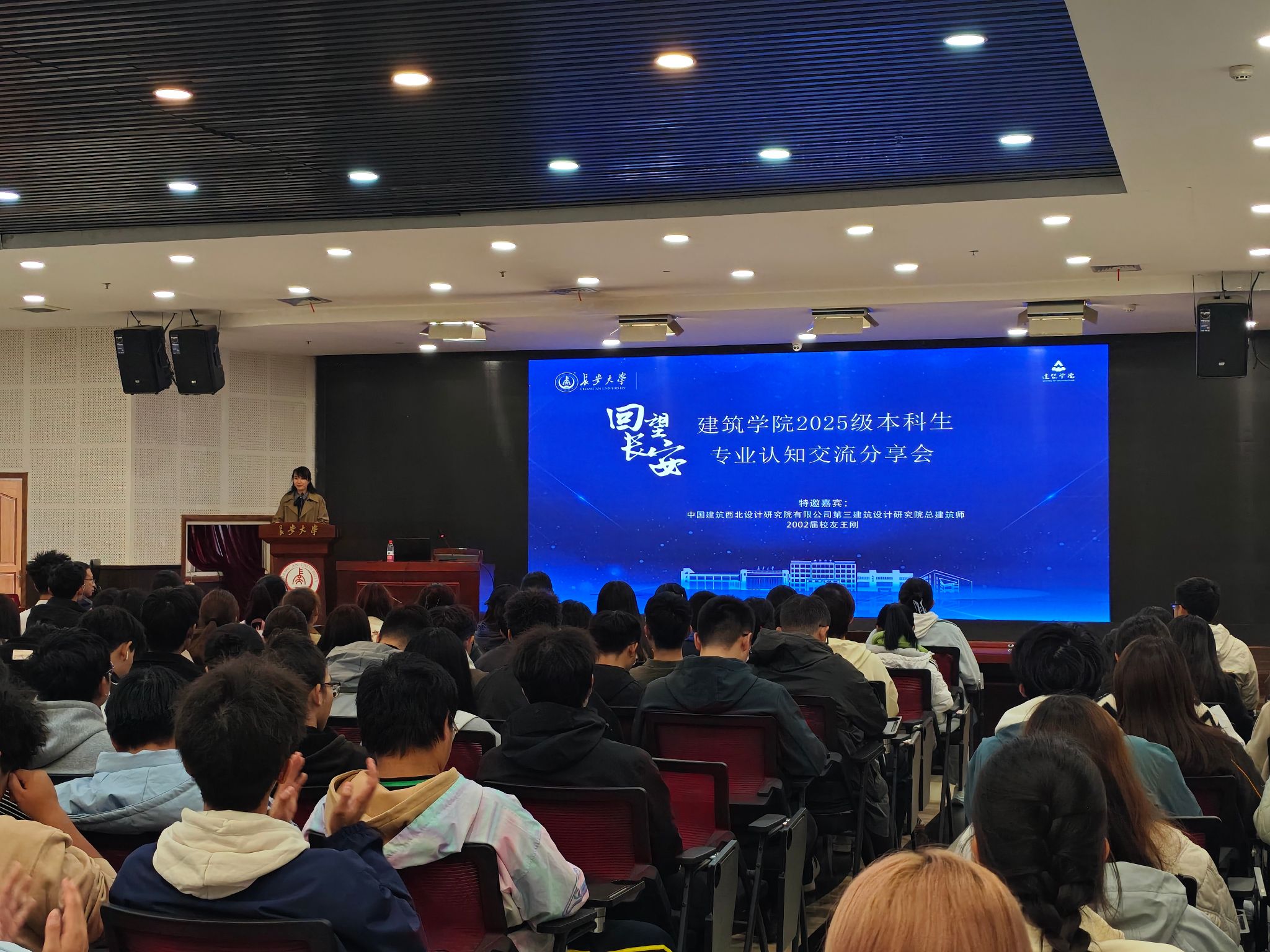 10月22日下午,建筑学院在长安文化艺术中心三楼多功能厅举办“回望长安”论坛(第七季)首场活动——本科生专业认知交流分享会(第一期)。活动邀请中国建筑西北设计研究院有限公司第三建筑设计研究院总建筑师、2002届校友王刚担任主讲嘉宾,学院党委副书记王妍婷,新生辅导员与全体2025级本科生参加。